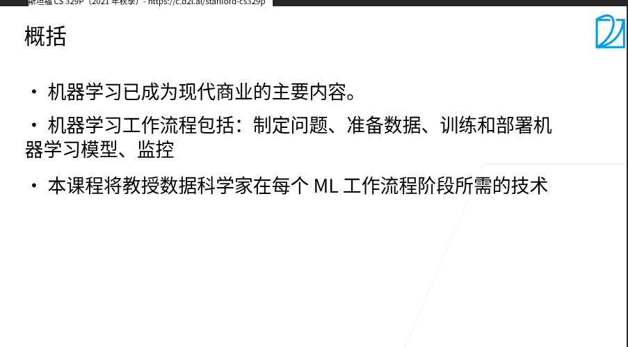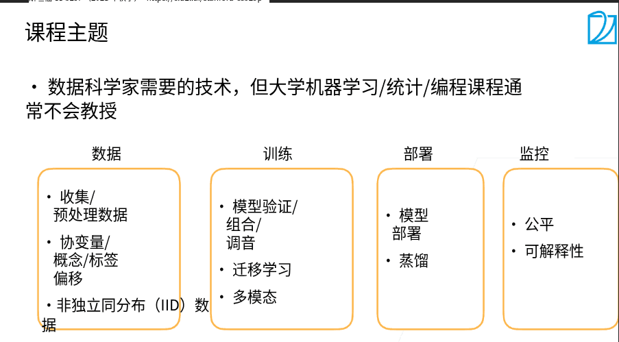 课程包括了ML从数据获取->数据清洗->模型架构选择->训练效果评估->参数调优