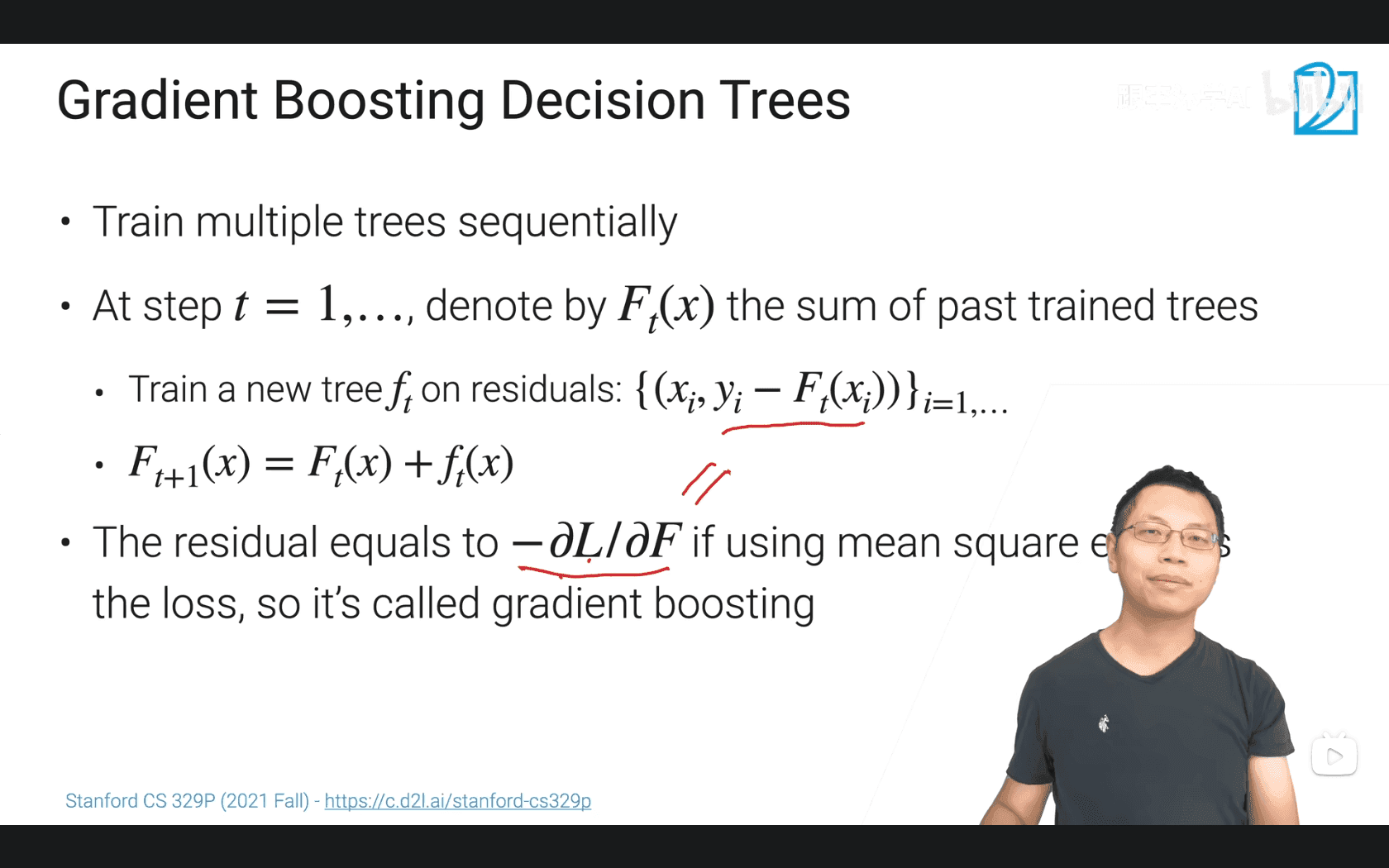 如果我们用均方误差(Mean Square Error,MSE)作为损失函数(衡量预测值和真实值差距的函数),数学上可以推导得出:此时 “残差”\(y_i - F_t(x_i)\),恰好等于损失函数对\(F_t(x)\)的负梯度\((-\frac{\partial L}{\partial F}\))。这意味着:用残差去训练新树,本质上是在沿着 “损失函数下降最快的方向(梯度方向)” 去优化模型—— 就像 “梯度下降” 算法找最优解的思路一样。所以这种方法被称为 “梯度提升”(Gradient Boosting)。 简单总结:GBDT 通过 “顺序训练决策树,每棵新树拟合前序模型的残差(或损失的负梯度),再累加所有树” 的方式,逐步把预测效果提升到很好,而 “梯度” 的特点体现在 “用损失的梯度方向指导新树学习” 这一点上