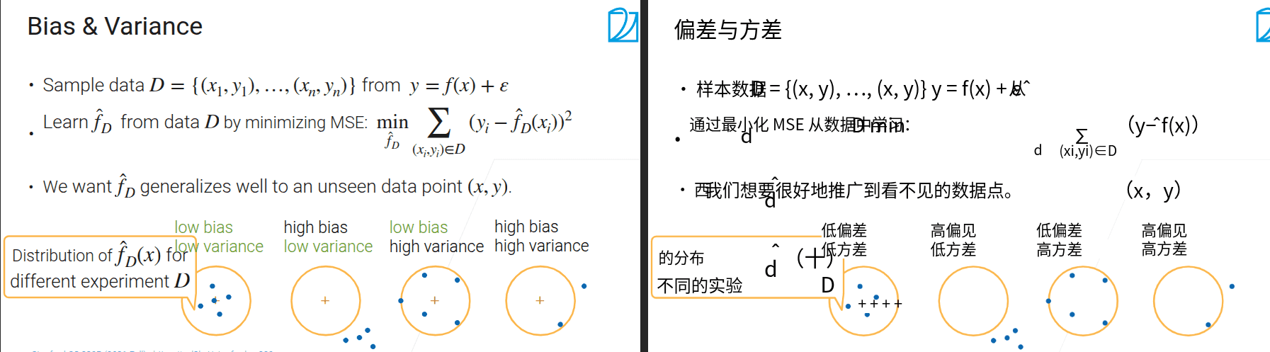 - 高偏差:子弹集中在靶心外侧(模型整体偏离真实规律)。