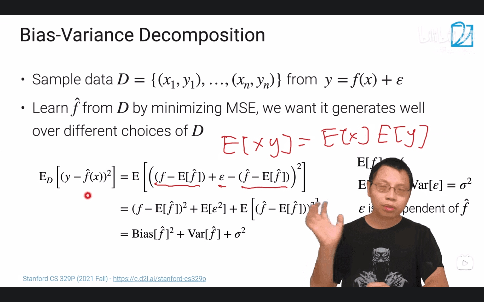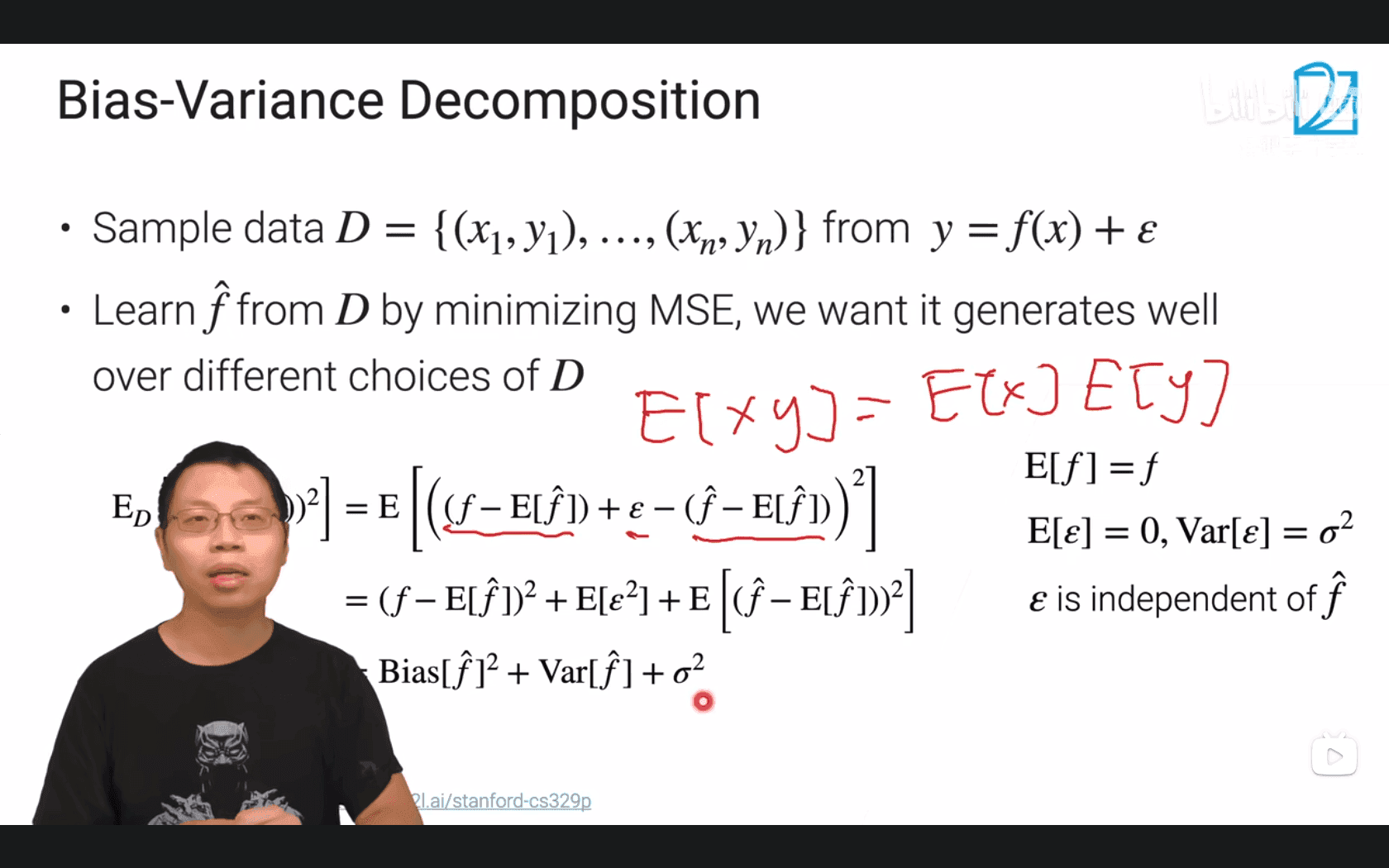 推导步骤: 展开右边的期望: $$ \begin{align} \mathbb{E}_D\left[ \left( f(x) - \hat{f}_D(x) \right)^2 \right] &= \mathbb{E}_D\left[ \left( (f(x) - \hat{f}(x)) + (\hat{f}(x) - \hat{f}_D(x)) \right)^2 \right] \ &= \mathbb{E}_D\left[ (f(x) - \hat{f}(x))^2 + 2(f(x) - \hat{f}(x))(\hat{f}(x) - \hat{f}_D(x)) + (\hat{f}(x) - \hat{f}_D(x))^2 \right] \end{align} $$