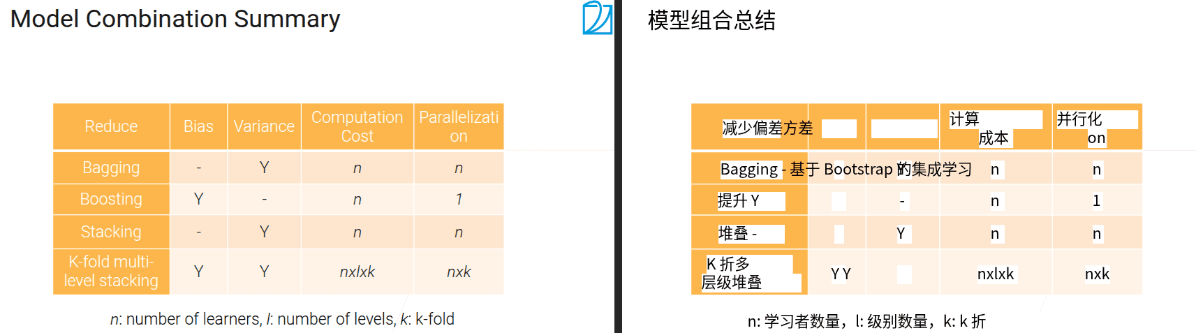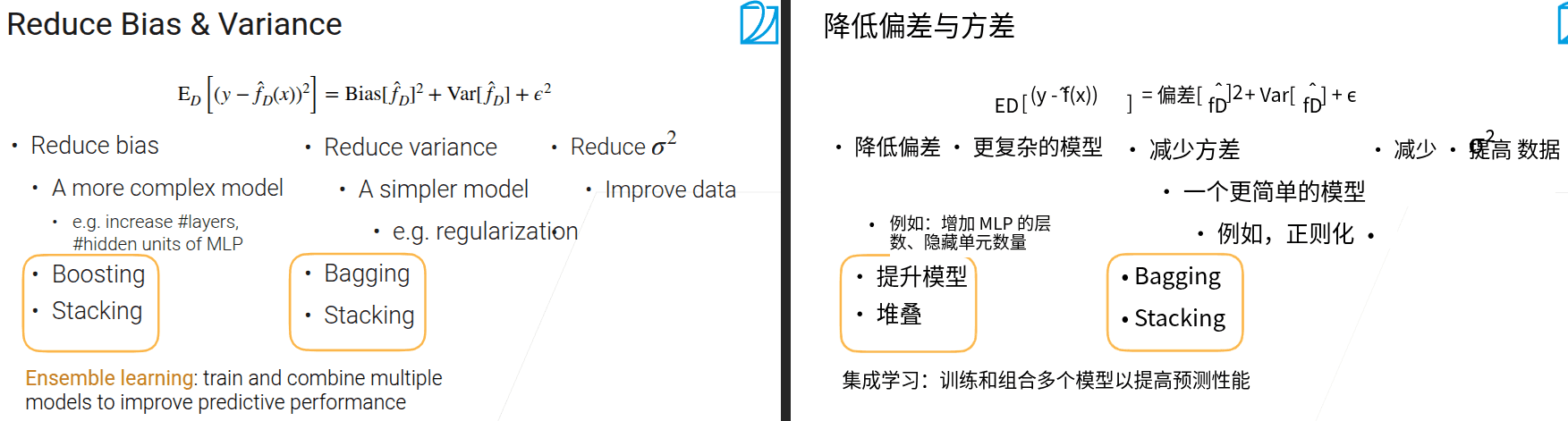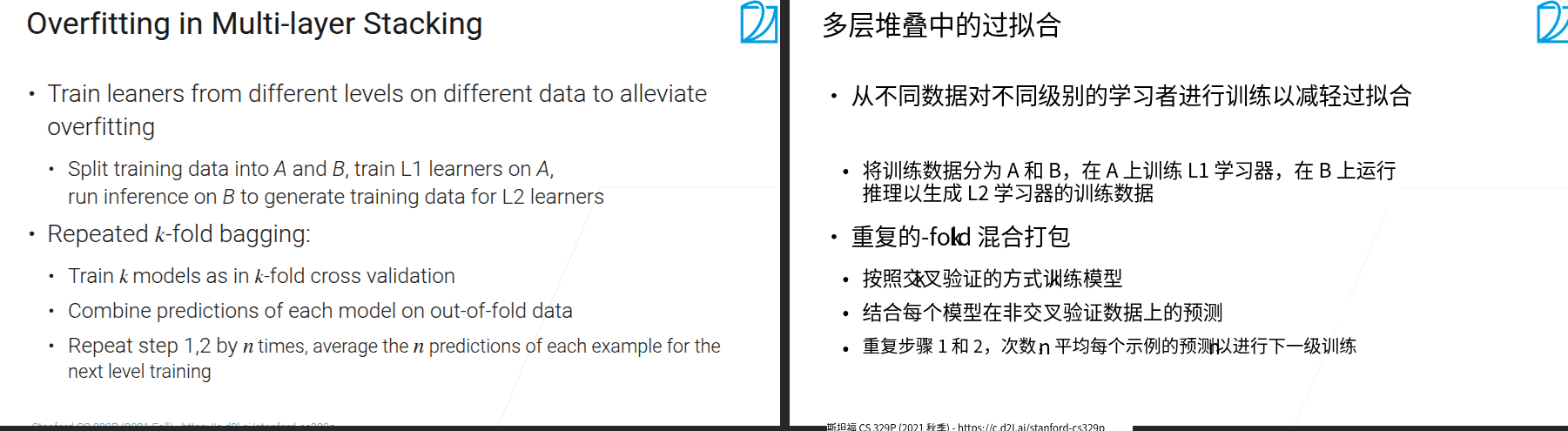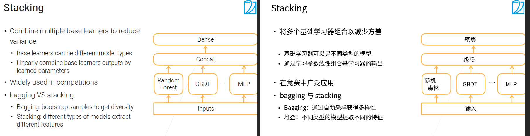 - stacking在相同数据上训练不同的模型。种类不一样,所以差别很大,以此来降低方差