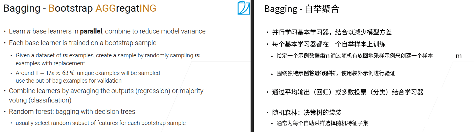 Bagging的数学本质是:通过“多个不稳定学习器的平均/投票”,利用期望不等式和方差平均抵消的原理,让集成后的模型比单个学习器更稳定(方差更小),从而提升预测精度。