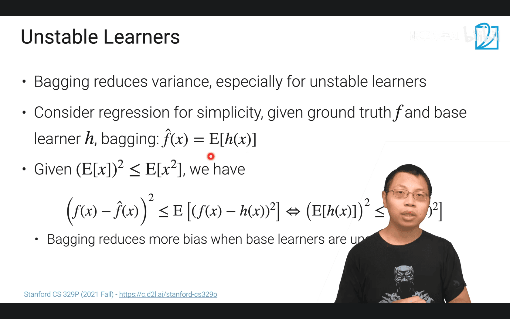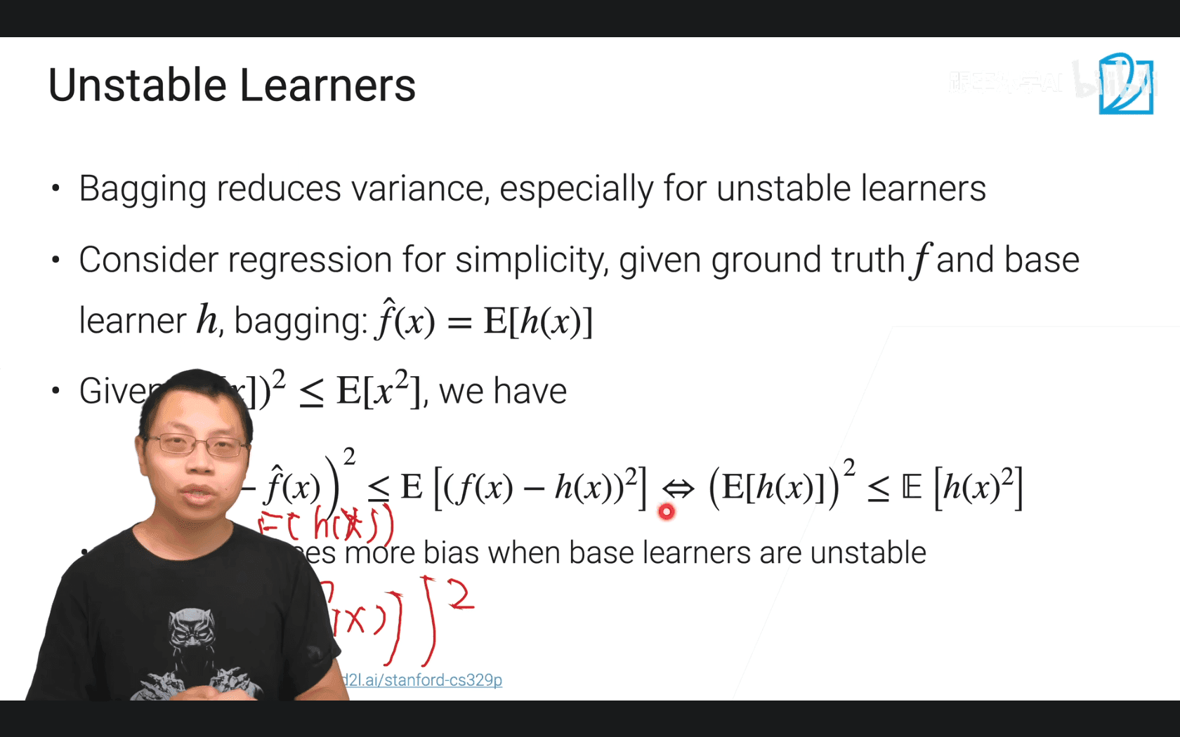 - 单个基础学习器的误差期望:$ \mathbb{E}_D\left[ \left( f(x) - \hat{f}_D(x) \right)^2 \right] $(对所有可能的Bootstrap子集 $ D $,单个学习器误差的平均)。