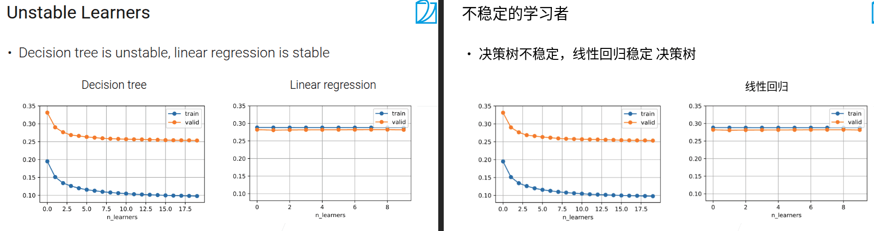 之所以有效,是因为单个不稳定学习器的方差大(数据稍变,模型就大改),但多个学习器“集体决策”时,方差会被平均抵消,从而让整体模型更稳定。